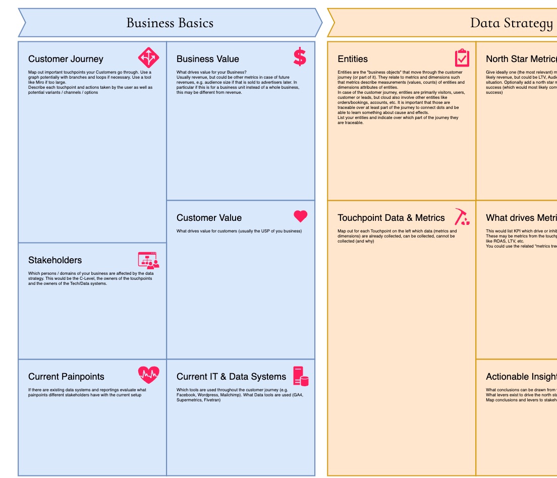 Based on experience data consulting projects for companies like mobile.de/ eBay, P&C, Siematic, One Hiring, etc. we know which questions to ask. We have compiled this knowledge into a Data Thinking Canvas which makes sure that